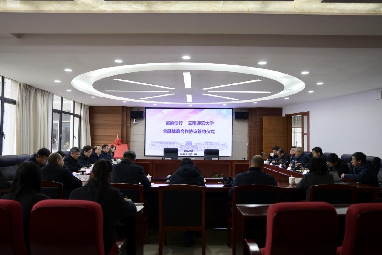 12月25日,云南师范大学与富滇银行股份有限公司金融战略合作协议签约仪式在呈贡校区举行。富滇银行党委书记、董事长代军,行长曾晓松,副行长王克强,云南师范大学党委书记张祖武,校长胡金明,副校长尚轶,相关单位负责人参加仪式。会议由胡金明主持。